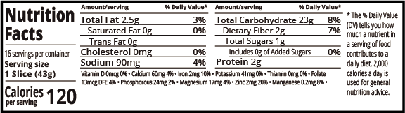 Organic Sprouted Quinoa (Red and/or White), Filtered Water, Organic Arrowroot, Organic Potato Starch, Organic Sprouted Millet, Organic Tapioca Flour, Apllesauce, Organic Sprouted Flax, Safflower Oil, Organic Chia Seeds, Cactus, Organic Agave, Vanilla, Sea Salt, Xantham Gum, Yeast, Psyllium Husk.